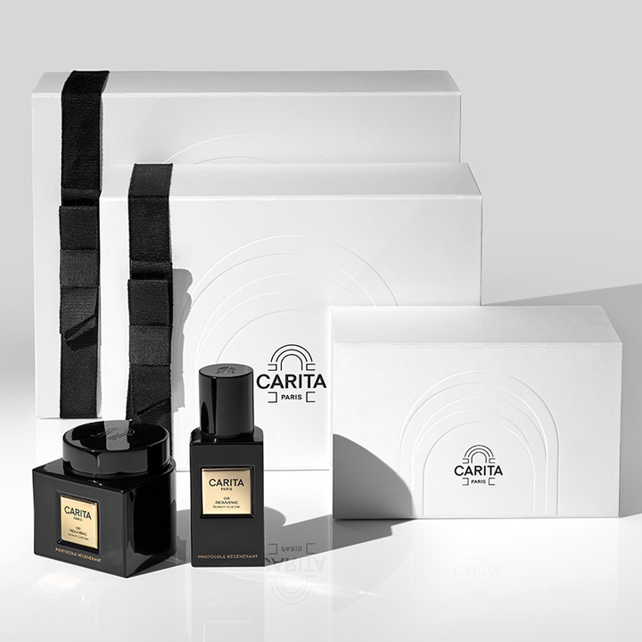 Carita è lieta di offrirle un'esclusiva selezione di quattro prodotti di bellezza indispensabili. Riceva la nostra trousse Signature, accompagnata da un prestigioso kit di prova Or Rejuvenic (crema da 5 ml e siero da 5 ml), con qualsiasi acquisto a partire da 250€. Una tradizione di cura professionale arricchita dall'oro: l'eleganza a portata di mano.
